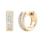 A sophisticated 14k yellow gold huggie featuring a half band of baguette and round-cut diamonds contrasted by a sleek solid gold finish. With its thick, structured design and luminous sparkle, this piece delivers modern elegance in every detail.